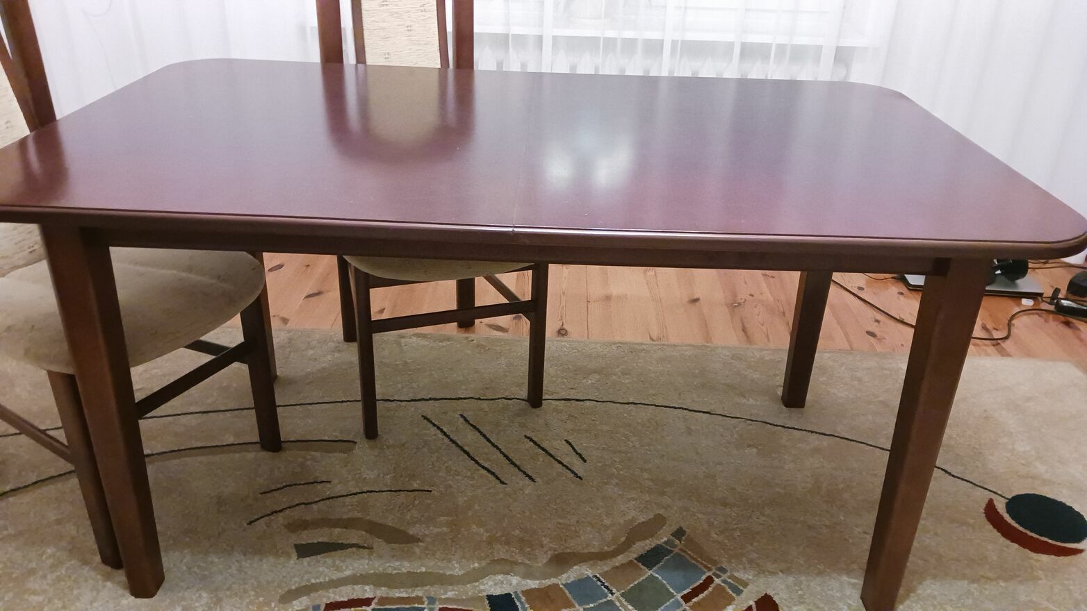 Sprzedam stół rozkładany w ciemnym kolorze. Nadaje się do jadalni lub salonu. Wymiary: długość 153 cm z możliwością przedłużenia o segment o długości 47 cm, szerokość - 90 cm, wysokość - 75 cm. Przy przeciąganiu został uszkodzony, ale naprawiony. Jest możliwość zakupu w komplecie z 6 krzesłami. Cena do negocjacjiSprawdź zainteresowanie tym ogłoszeniem